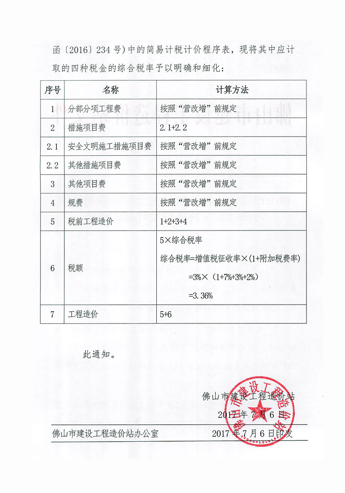 佛山市建設工程造價站關于明確簡易計稅方法計價中有關稅金計取的通知