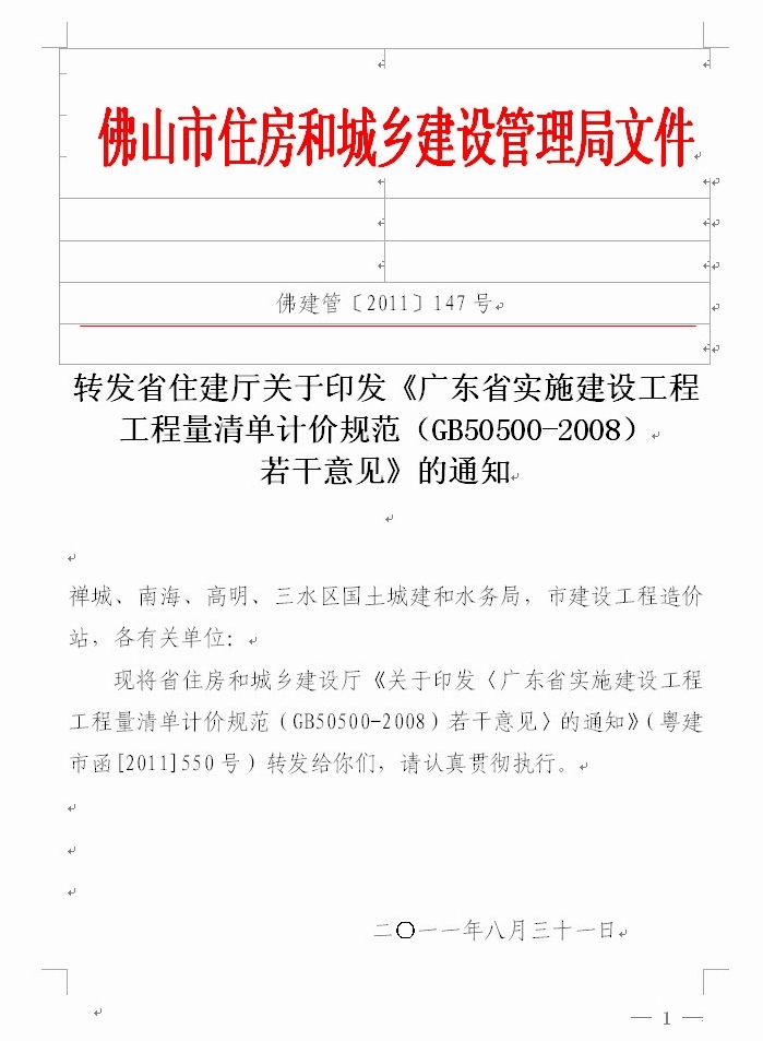 轉發省住建廳關于印發《廣東省實施建設工程工程量清單計價規范(GB50500-2008)