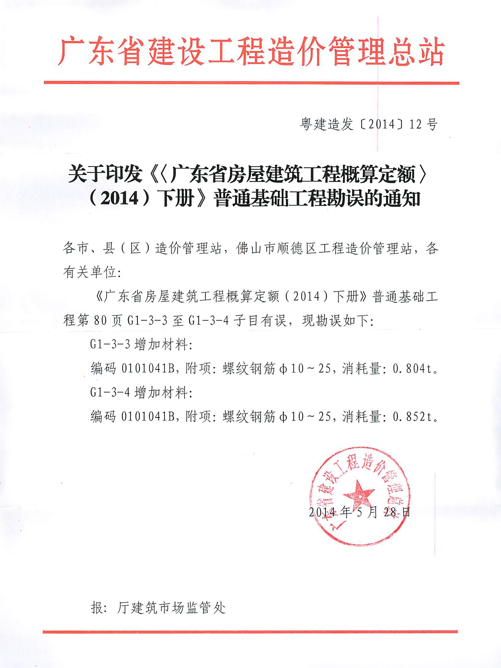 關(guān)于印發(fā)《<廣東省房屋建筑工程概算定額>(2014)下冊》普通基礎(chǔ)工程勘誤的通知