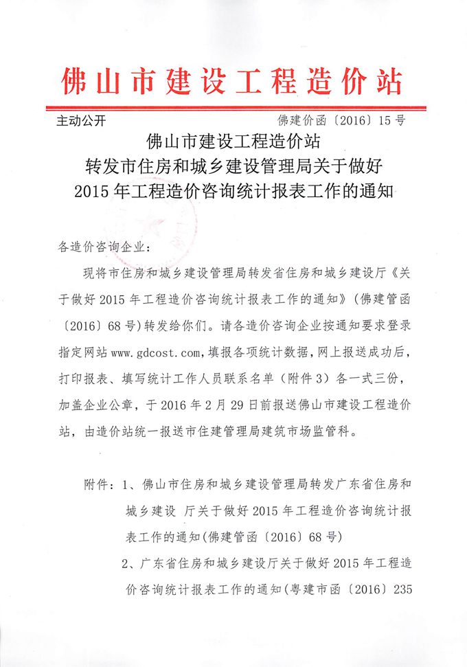 佛山市建設(shè)工程造價站轉(zhuǎn)發(fā)省住房和城鄉(xiāng)建設(shè)廳關(guān)于做好2015年工程造價咨詢統(tǒng)計報表工作的通知