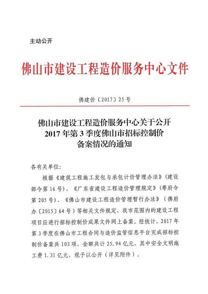 佛山市建設工程造價服務中心關于公開2017年第3季度佛山市招標控制價備案情況的通知