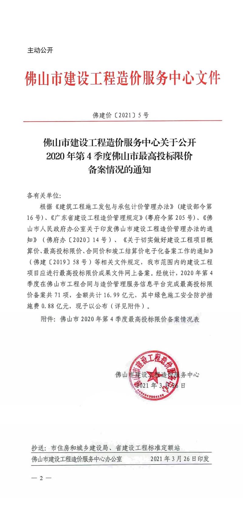 佛山市建設工程造價服務中心關于公開2020年第4季度佛山市最高投標限價備案情況的通知