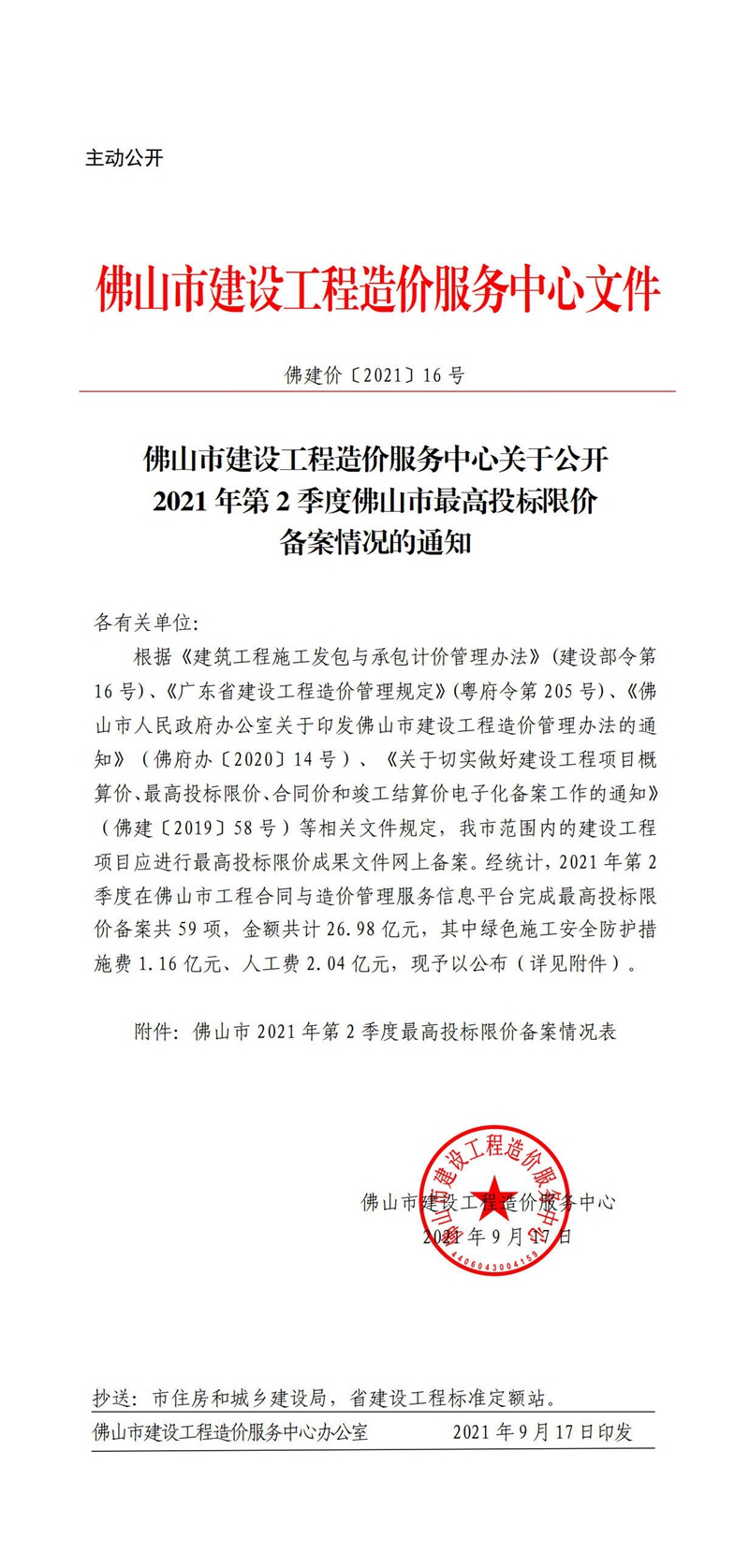 佛山市建設工程造價服務中心關于公開2021年第2季度佛山市最高投標限價備案情況的通知