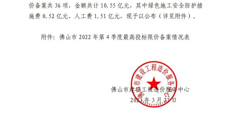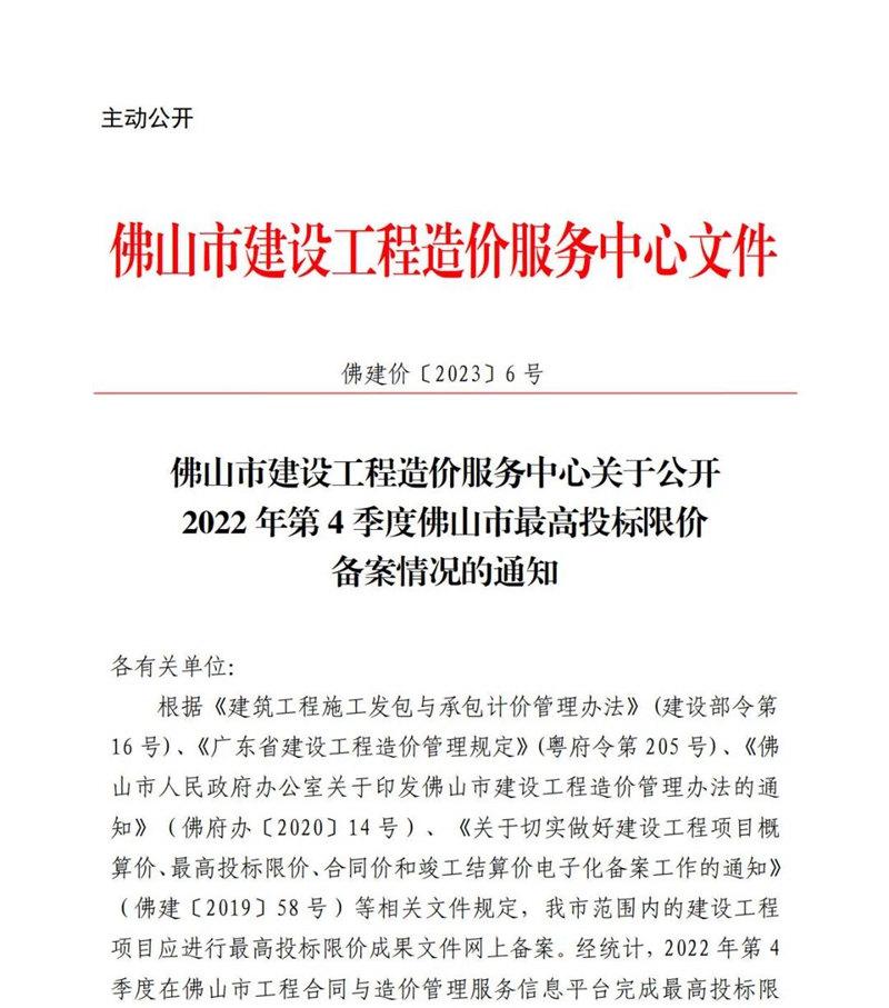 佛山市建設工程造價服務中心關于公開2022年第4季度佛山市最高投標限價備案情況的通知