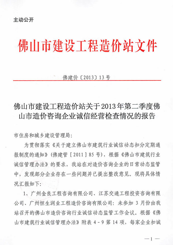 佛山市建設工程造價站關于2013年第二季度佛山市造價咨詢企業誠信經營檢查情況的報告