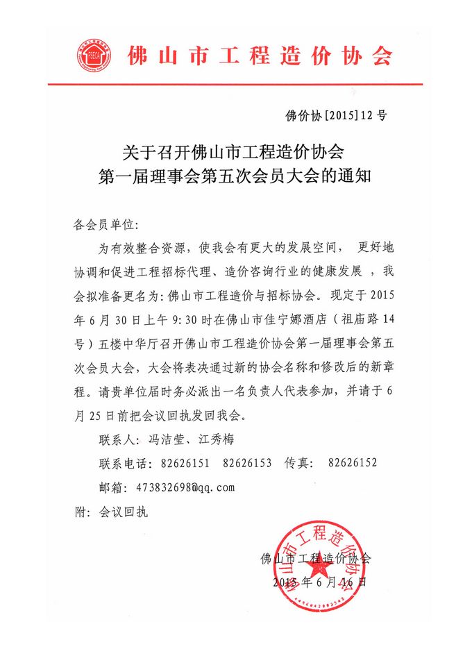 關于召開佛山市工程造價協會第一屆理事會第五次會員大會的通知