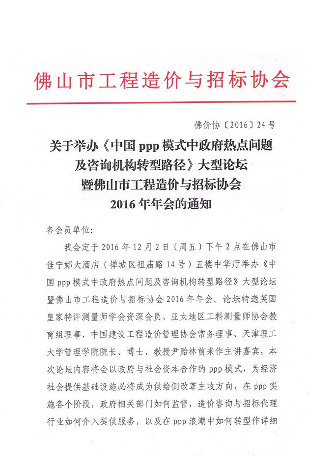 關于舉辦《中國ppp模式中政府熱點問題及咨詢機構轉型路徑》大型論壇暨佛山市工程造價與招標協會2016年年會的通知