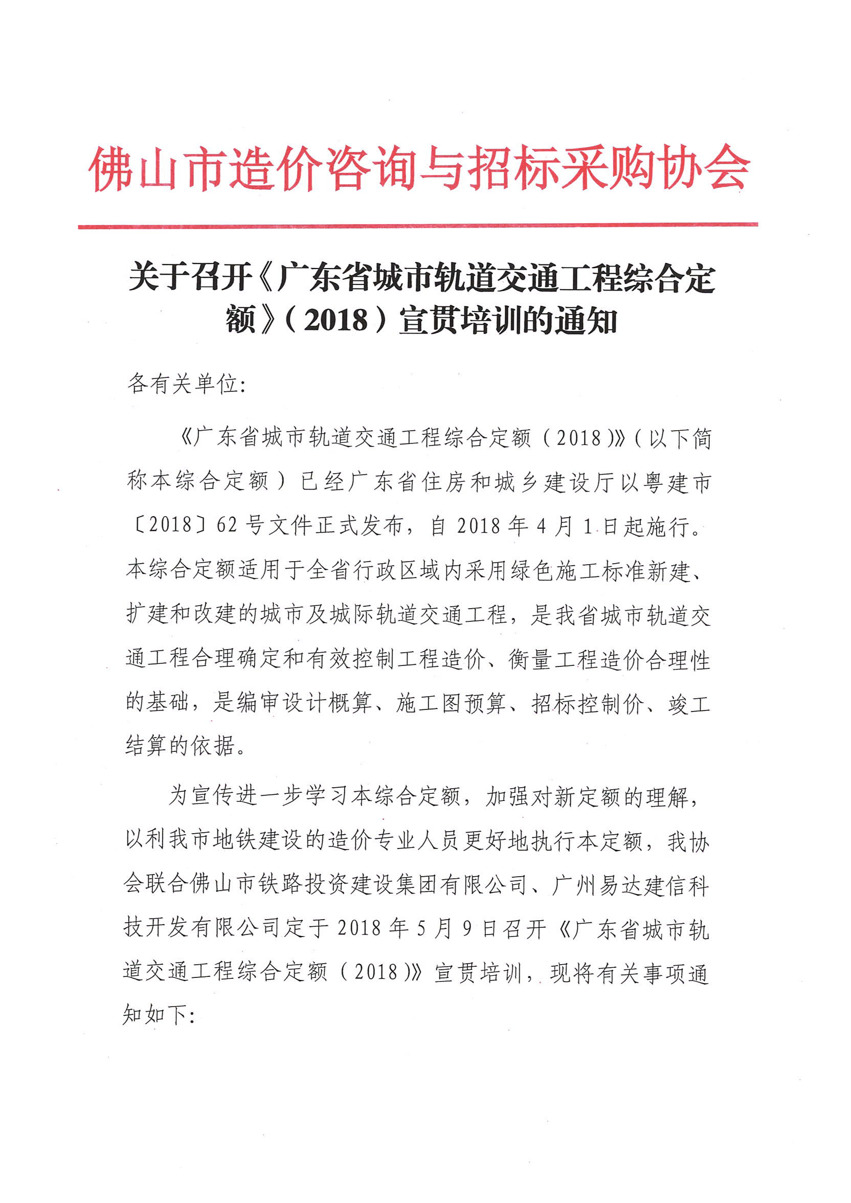 關(guān)于召開《廣東省城市軌道交通工程綜合定額》(2018)宣貫培訓(xùn)的通知