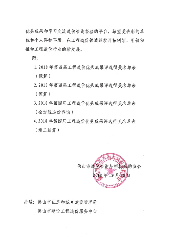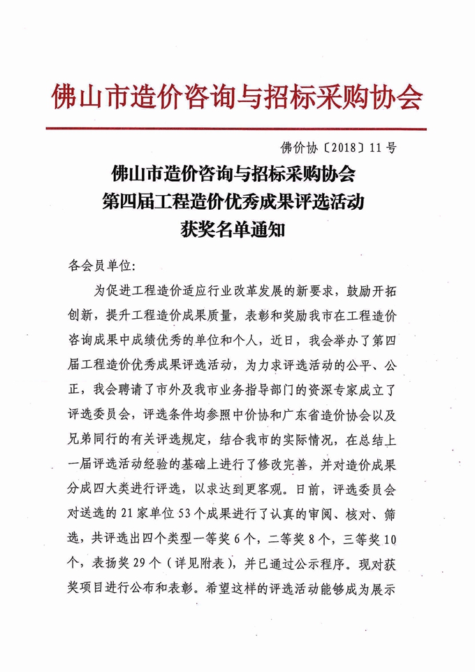 佛山市造價咨詢與招標采購協會第四屆工程造價優秀成果評選活動獲獎名單通知