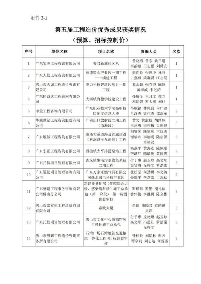 佛山市造價咨詢與招標采購協會關于第五屆工程造價優秀成果評選活動獲獎名單的通知
