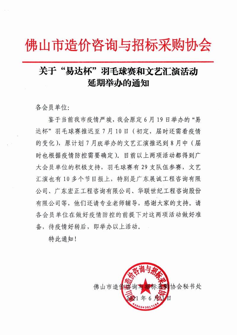 關于“易達杯”羽毛球賽和文藝匯演活動延期舉辦的通知