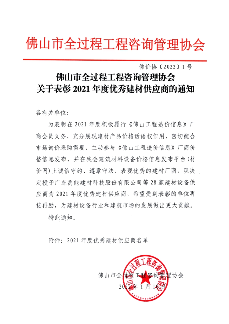 關(guān)于表彰2021年度優(yōu)秀建材供應(yīng)商的通知
