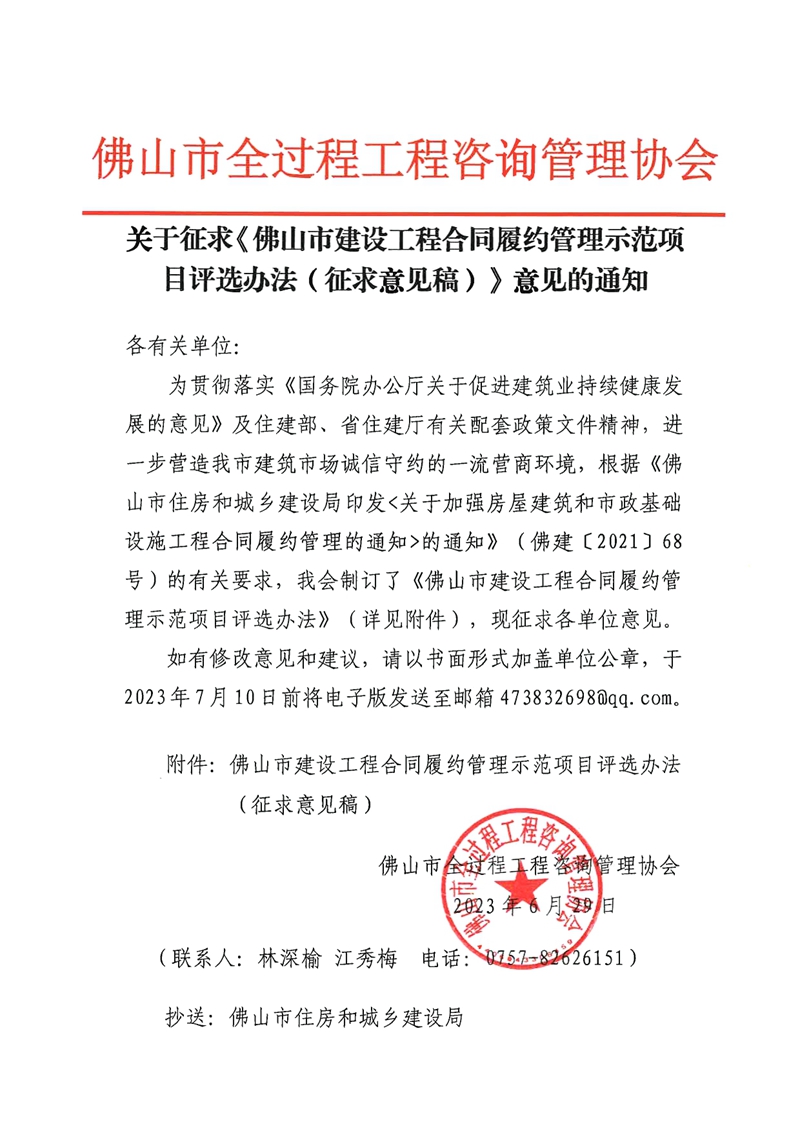 關(guān)于征求《佛山市建設(shè)工程合同履約管理示范項目評選辦法(征求意見稿)》意見的通知