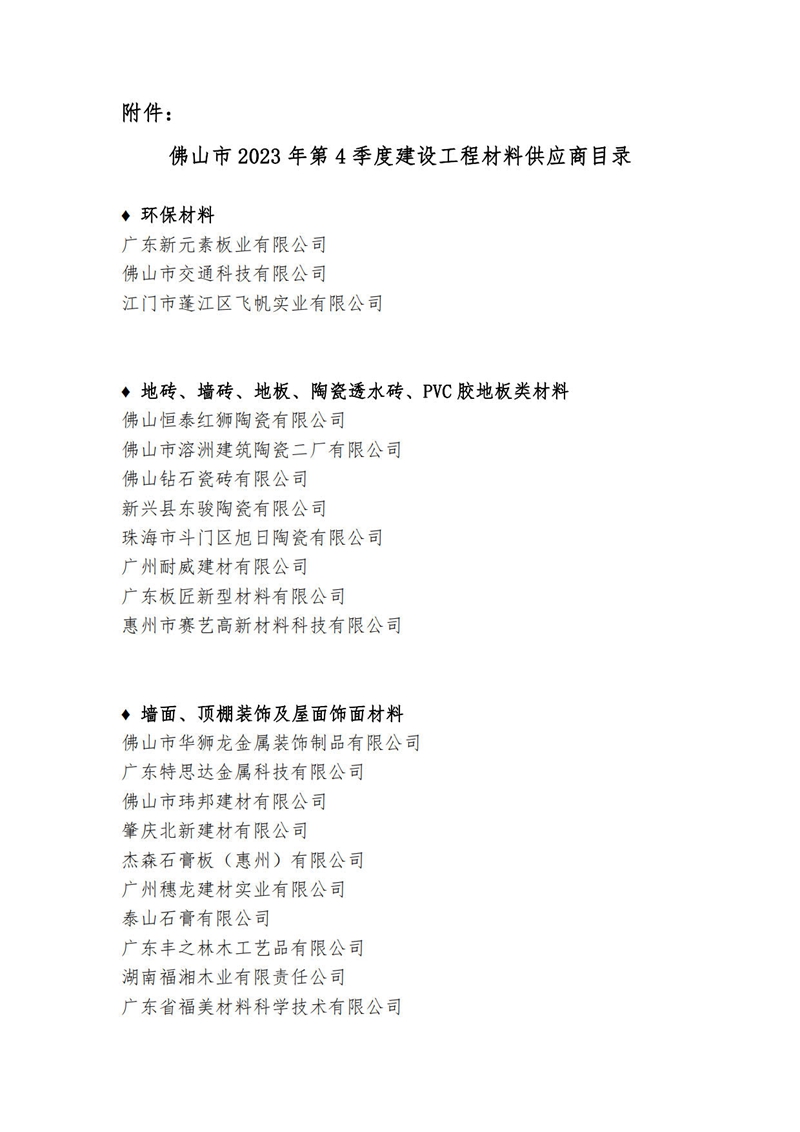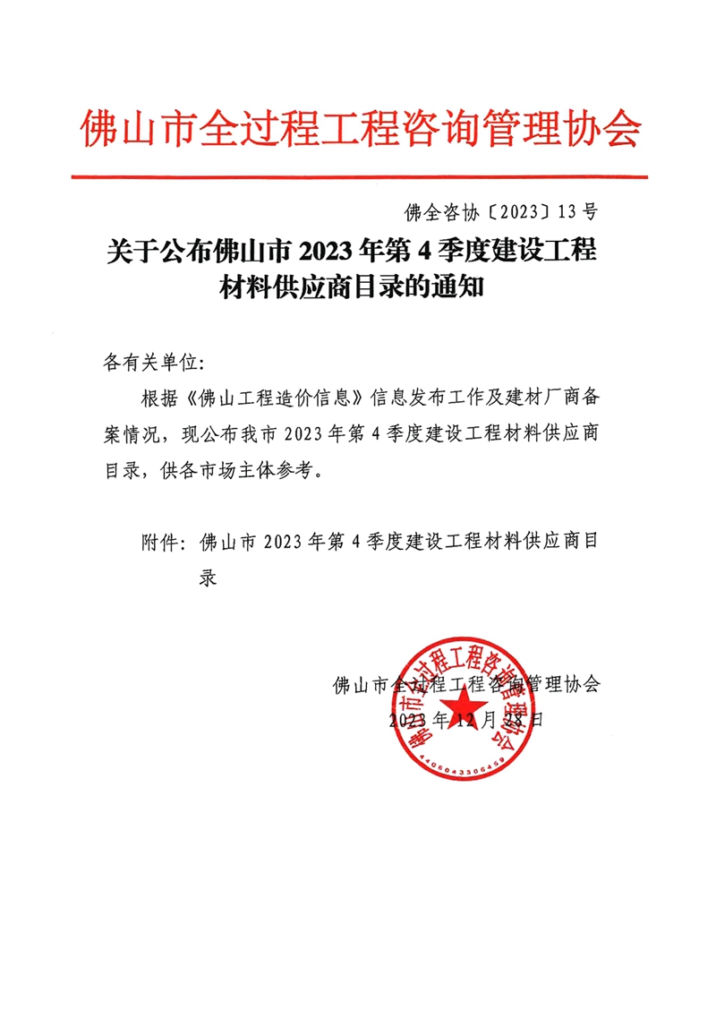 關(guān)于公布佛山市2023年第4季度建設(shè)工程材料供應(yīng)商目錄的通知