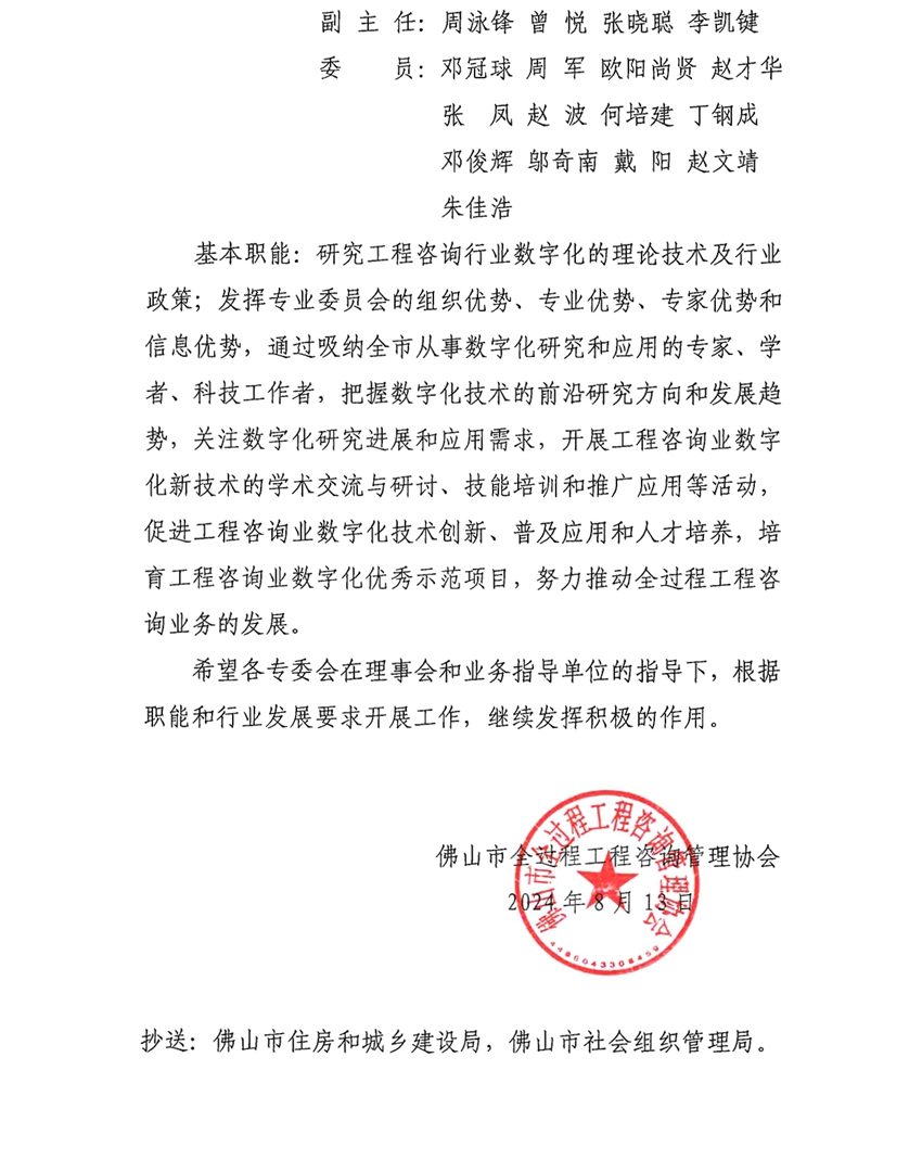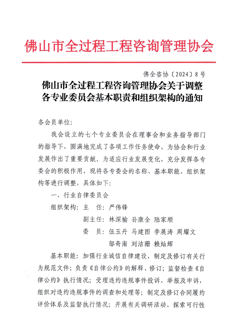 佛山市全過程工程咨詢管理協會關于調整各專業委員會基本職責和組織架構的通知