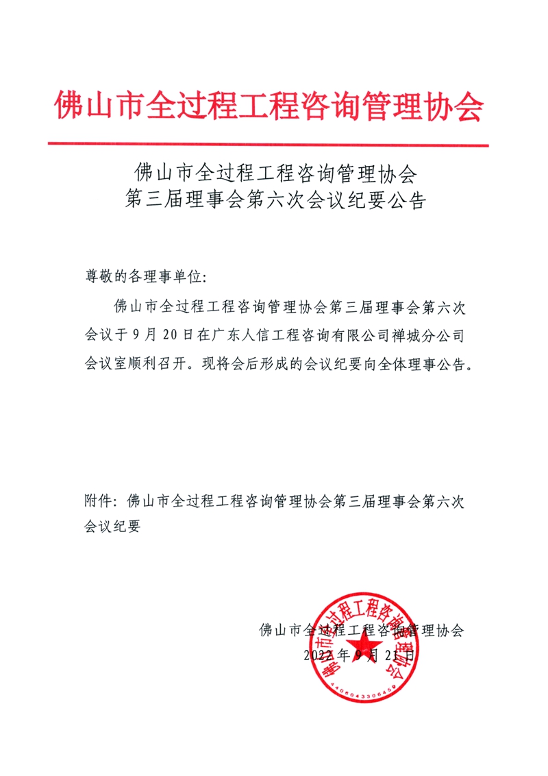 佛山市全過程工程咨詢管理協(xié)會(huì)第三屆理事會(huì)第六次會(huì)議紀(jì)要公告
