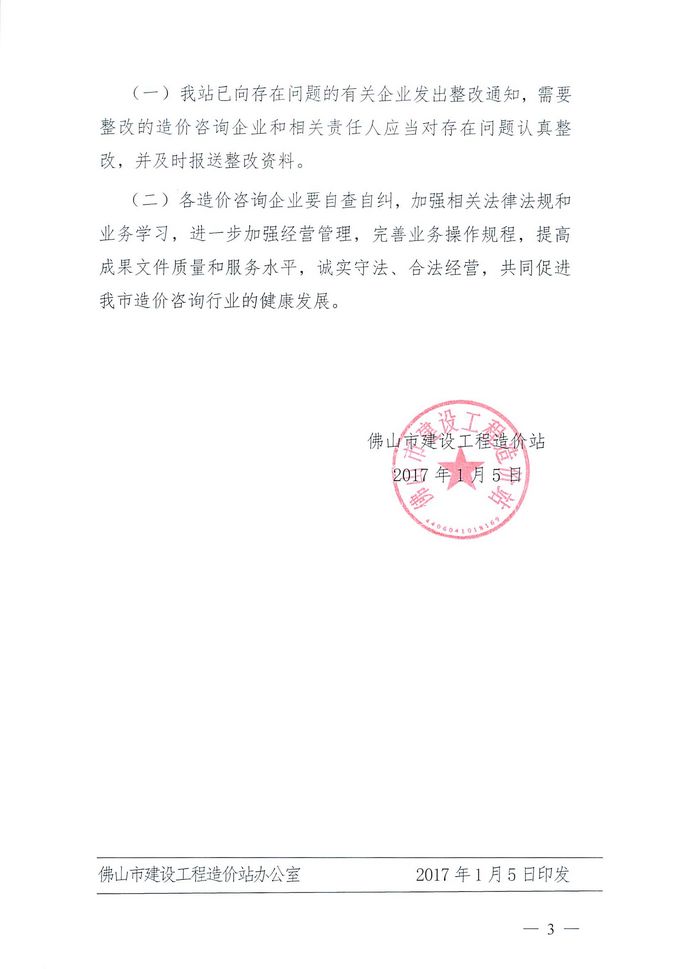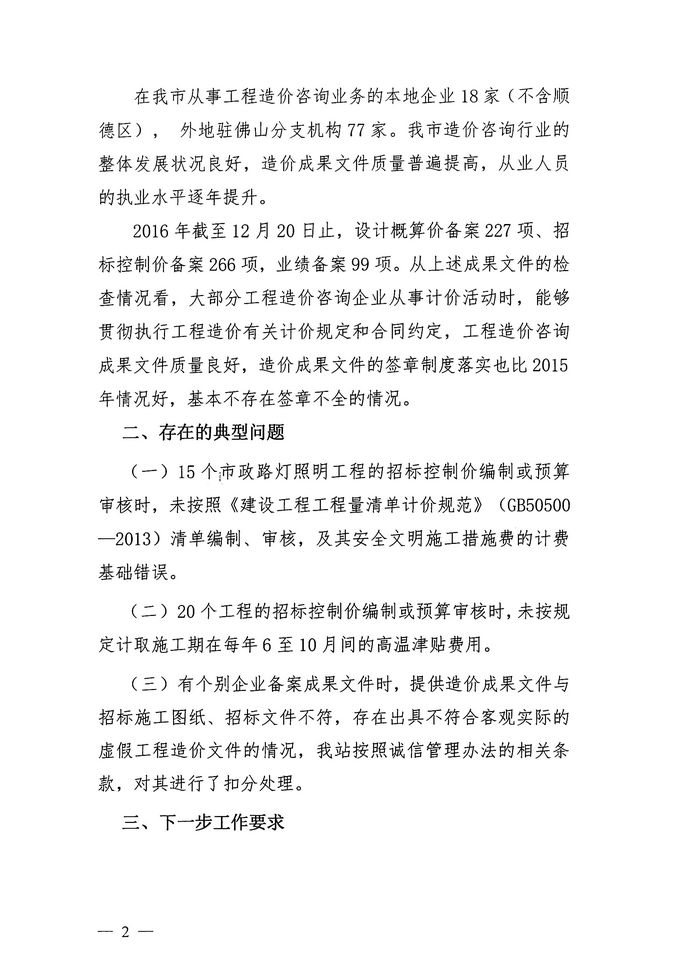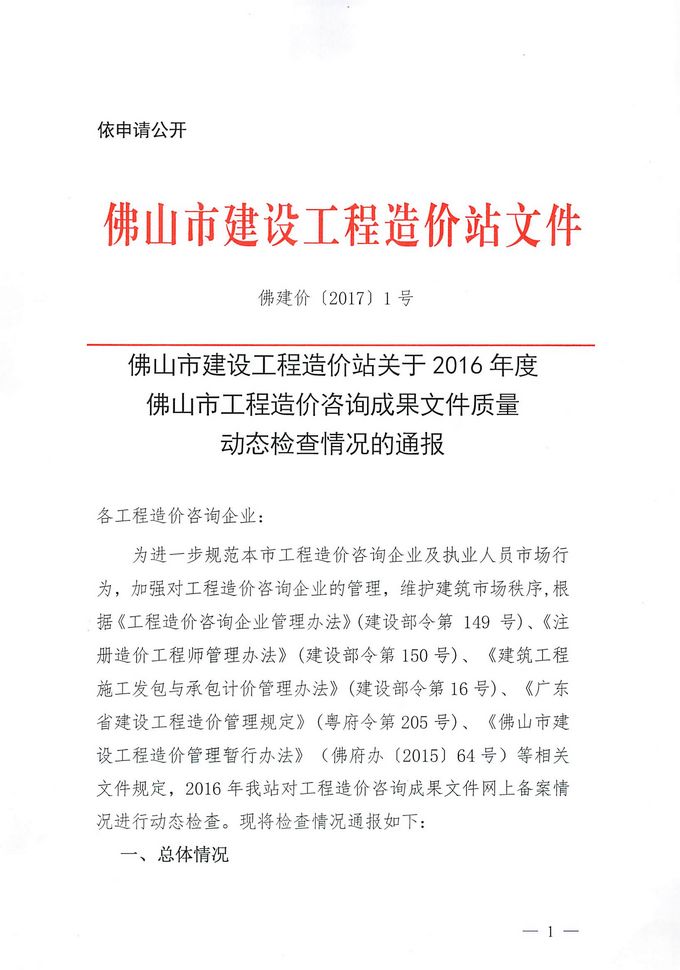 佛山市建設工程造價站關于2016年度佛山市工程造價咨詢成果文件質量動態檢查情況的通報