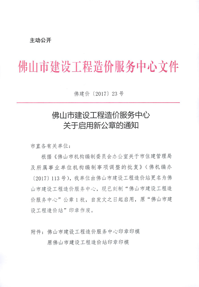 佛山市建設(shè)工程造價服務(wù)中心關(guān)于啟用新公章的通知