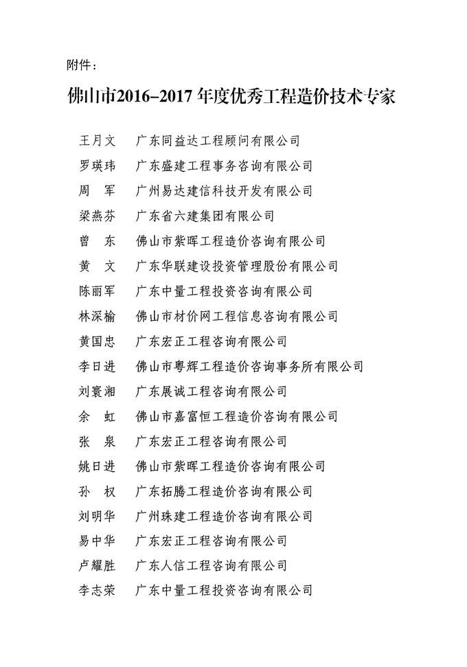 關于表彰佛山市2016-2017年度優秀工程造價技術專家的通知