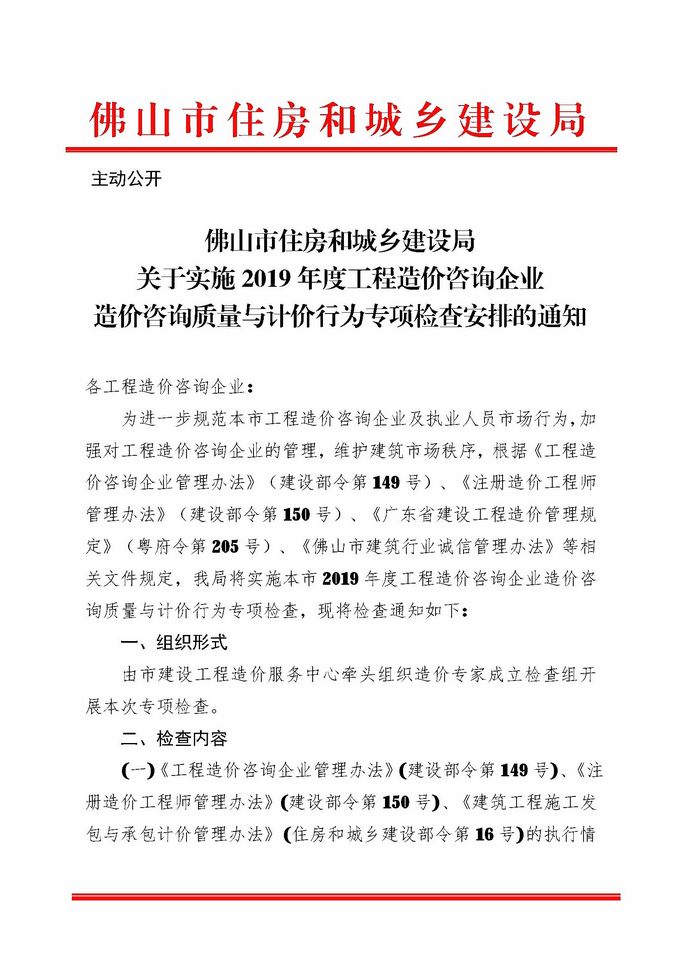 佛山市住房和城鄉建設局關于實施2019年度工程造價咨詢企業造價咨詢質量與計價行為專項檢查安排的通知