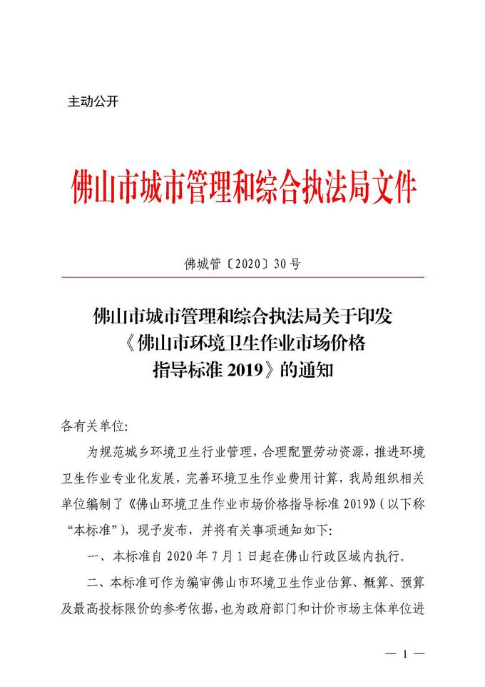 佛山市城市管理和綜合執(zhí)法局關(guān)于印發(fā)《佛山市環(huán)境衛(wèi)生作業(yè)市場(chǎng)價(jià)格指導(dǎo)標(biāo)準(zhǔn)2019》的通知