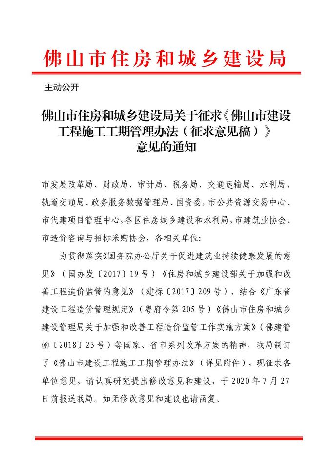 佛山市住房和城鄉建設局關于征求《佛山市建設工程施工工期管理辦法(征求意見稿)》意見的通知