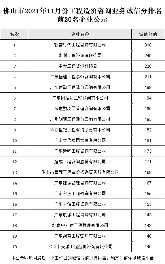 佛山市2021年11月份工程造價(jià)咨詢業(yè)務(wù)誠信分排名前20名企業(yè)公示