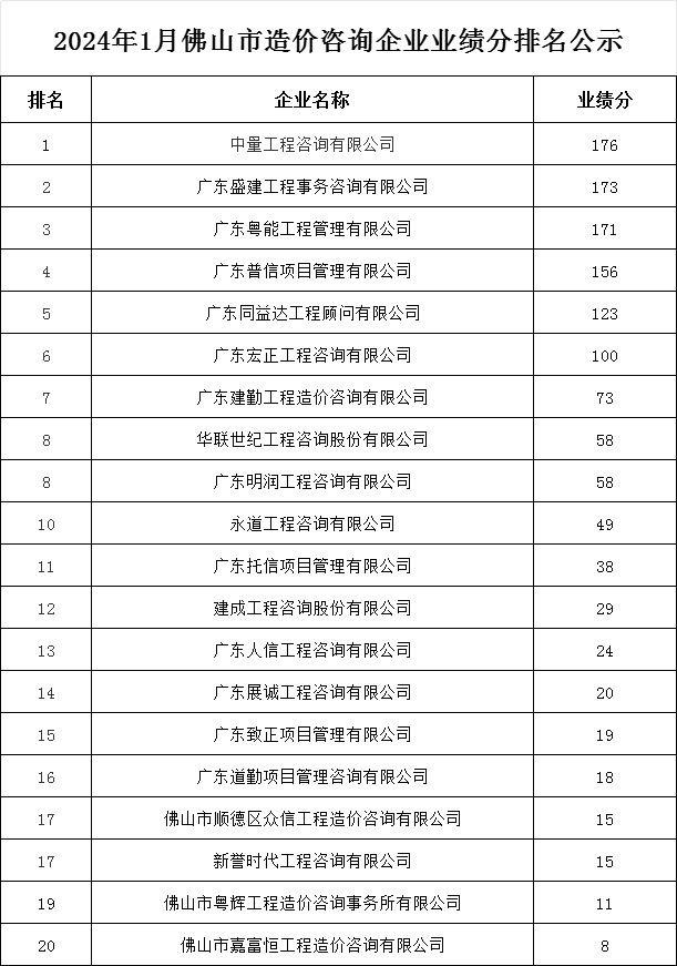 轉發 | 2024年1月佛山市造價咨詢企業業績分排名公示