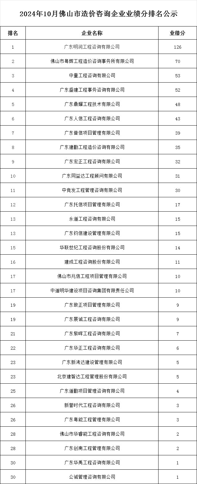轉(zhuǎn)發(fā) | 2024年10月佛山市造價咨詢企業(yè)業(yè)績分排名公示