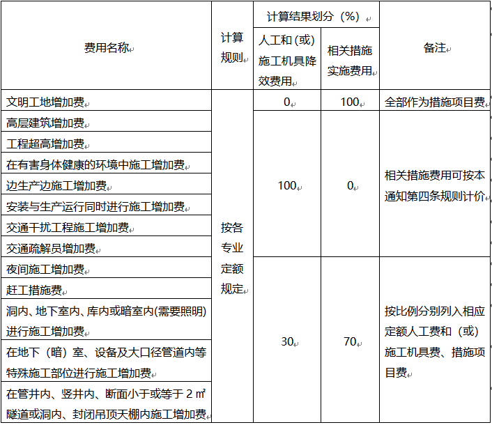 例如,①工程超高增加費:下表顯示全部屬于人工和(或)施工機具降效費用,因其計算基礎為人工費,則工程超高增加費全部為人工降效費用,在執行相應定額時即可將定額人工費乘以工程超高增加費費率進行計算,并參與計取管理費和利潤。②趕工措施費:下表顯示按相關專業定額規定計算結果的30%為人工和()施工機具降效費用,因其計算基礎為(人工費+施工機具費),則趕工措施費的30%為人工和施工機具降效費用,在執行相應定額時即可將定額人工費、施工機具費分別乘以趕工措施費費率的30%進行計算,并參與計取管理費和利潤,而按相關專業定額規定計算結果的70%作為相關措施實施費用放入趕工措施費。③文明工地增加費:下表顯示全部屬于相關措施實施費用,即為文明工地措施費。