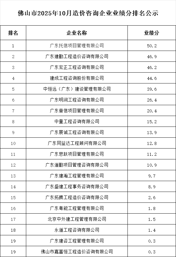 轉發 | 佛山市2025年10月造價咨詢企業業績分排名公示