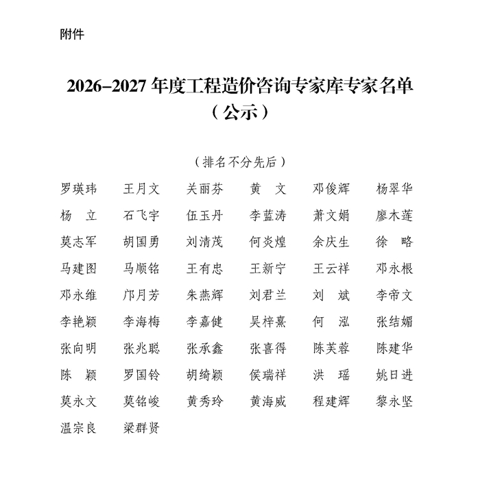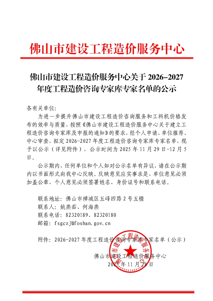 轉發 | 佛山市建設工程造價服務中心關于2026-2027年度工程造價咨詢專家庫專家名單的公示