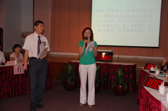 全市工程造價行業知識競賽2008年7月2日上午在佛山市禪城區佳寧娜大酒店中華廳舉行。全市五區和外地駐市造價咨詢企業派出的11支隊伍共33人參加競賽,各參賽區、企業也組織了啦啦隊助興。競賽過程場面氣氛活躍、緊張、熱烈、有序。經過激烈的角逐,禪城區二隊(佛山市紫暉公司隊)奪得第一名,南海區一隊(佛山智勤、南海宏正、南海創南公司隊綜合組隊)、順德區二隊(順德人信公司隊)奪得第二名,禪城區一隊(佛山市同益達公司隊)、高明區隊(高明建信公司隊)、外地駐市一隊(廣東中量公司隊)奪得第三名,順德區二隊、南海區二隊、三水區一、二隊、外地駐市二隊等五支參賽隊獲優勝獎,順德區、南海區獲得優秀組織獎。