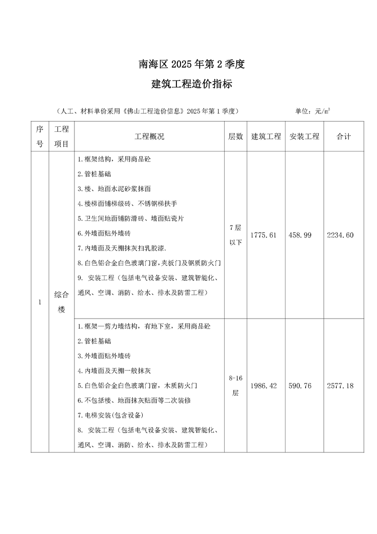 南海區(qū)2025年第2季度建筑工程造價指標(biāo)
