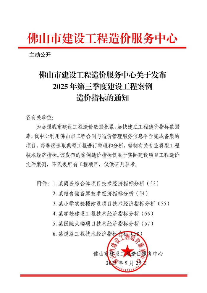 轉發 | 佛山市建設工程造價服務中心關于發布2025年第三季度建設工程案例造價指標的通知